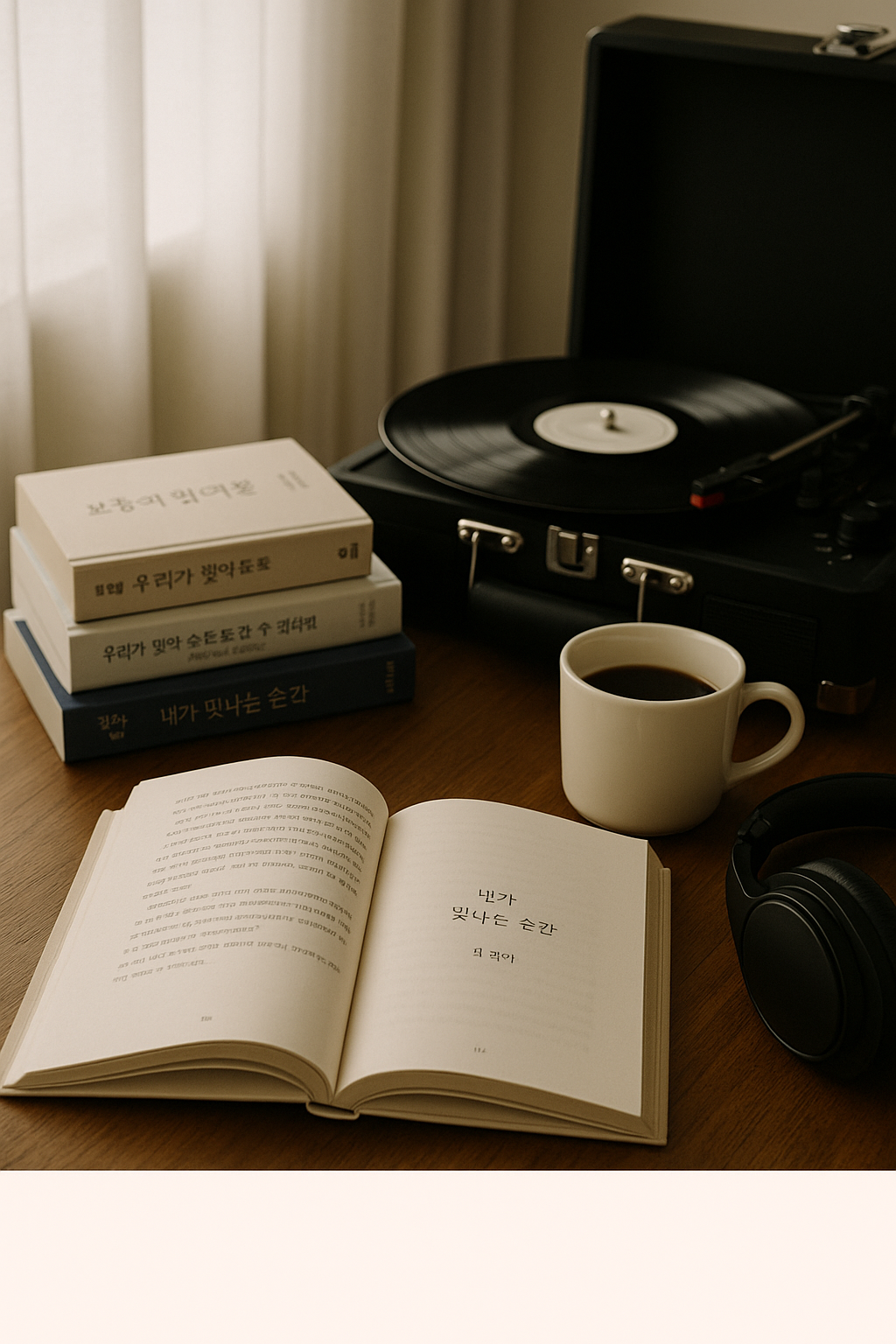 김이나의 또 다른 책 『내가 빛나는 순간』은 일상의 작은 순간을 반짝이게 만드는 글들로 채워져 있습니다. 이 책은 로파이 힙합 같은 편안하고 리드미컬한 음악과 잘 어울립니다. 바쁜 하루의 끝, 책과 음악을 곁들이면 그날의 무거운 감정이 가볍게 풀리며, 마음속 작은 자신감이 차오릅니다. 이 경험은 단순한 독서가 아니라, 음악과 글이 함께 만드는 자기 회복의 루틴이라 할 수 있습니다.